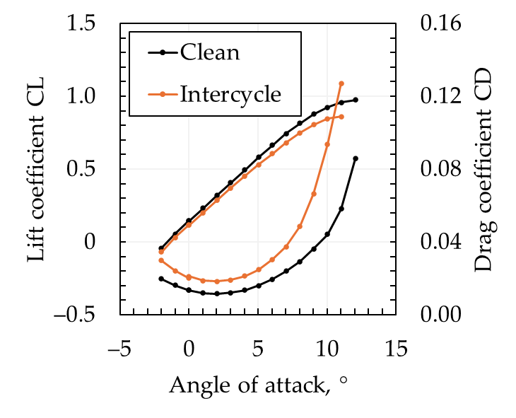 Results – The intercycle ice shape results in a degraded aerodynamic performance compared to the clean wing. At the realistic cruise angle of attack of 4°, the drag is increased by 58%, and the lift coefficient is reduced by 9%. This means that the aircraft would have to increase its thrust by 58% to continue its flight when flying with the intercycle ice shape compared to a clean aircraft.