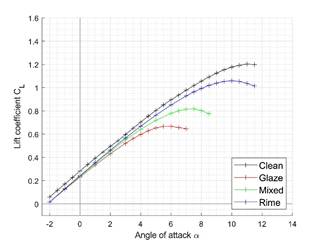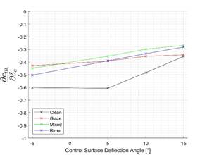 The longitudinal control derivative 𝐶𝑚𝛿e is defined as the change in moment when deflecting the control surface. This can be used in a simulator to study the flight behavior of an iced UAV. The figure below displays the control derivatives 𝐶𝑚𝛿e for the un-iced wing and with leading-edge ice accretion of three ice types for an angle of attack of 4°. Two aspects can be observed: First, the control surface effectiveness is reduced in comparison with the un-iced case. This means that, with the same deflection, less moment is generated, requiring greater deflection of the control surfaces, with all the downsides discussed earlier: reduced stall margins and increased drag. Secondly, while the change in moments generated when deflecting upward and downward is the same in the un-iced case, this no longer applies in the iced cases, leading potentially to unexpected behaviour when the control surfaces are used as ailerons and are deflected in opposite directions.