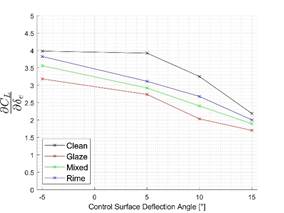 The (positive) deflection of a control surface on an un-iced airfoil increases lift coefficient and decreases the stall angle. Leading-edge ice accretion decreases both the lift coefficient and the stall angle. Combining both effects can result in hazardous flight situations. Looking at glaze ice as the most severe ice shape in terms of aerodynamic performance degradation, this effect becomes apparent. The undeflected case already shows a significant reduction in max. lift coefficient compared to the un-iced case. Deflecting the control surface shows the expected effect of increased lift; however, in a significantly reduced magnitude, not reaching the un-iced max. lift even at a 15° deflection angle. The results for the rime and mixed ice cases can be found in the corresponding publication.