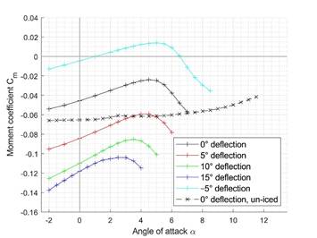 A third part of this investigation focuses on the impact on longitudinal stability and controllability of iced UAV wings. To evaluate the longitudinal stability of an airfoil against disturbances, the gradient of the curve is significant. A negative gradient indicates a statically stable behaviour, meaning the airfoil creates a moment to return to the initial flight attitude after a disturbance. While the un-iced pitching moment coefficient curve have mostly a negative gradient, all iced simulations feature a significantly greater positive gradient, revealing considerably more unstable behaviour. The curves of the pitching moment for the glaze ice cases can be found in the picture below.
