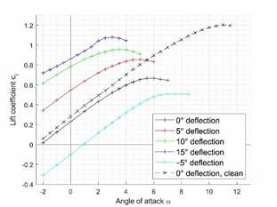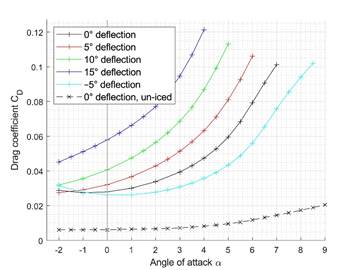 The reduction of the stall angle and thereby the max. lift coefficient has implications on the stall speed, i.e., the min. required velocity to be able to maintain horizontal flight at the stall angle. In all iced cases, this velocity is reduced, most severely for glaze. The higher velocity of the UAV produces more drag, which the thrust of the propeller must match. However, the drag coefficient is also impacted by the deflection of the control surface.