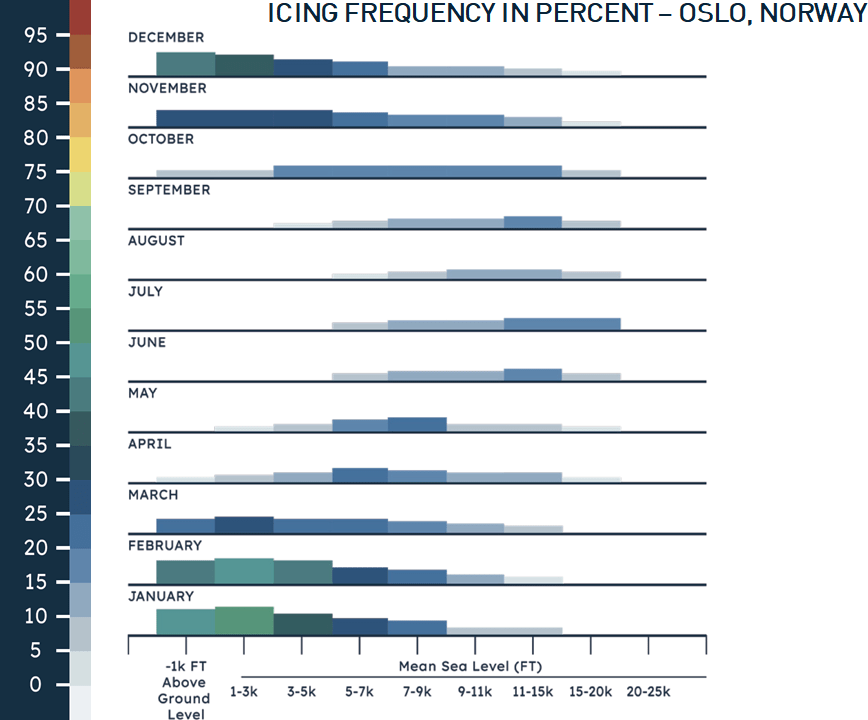Potential icing condition frequencies near Oslo airport at different altitudes for each month – based on a climate analysis spanning data from 2010-2019. Source: UBIQ Aerospace.