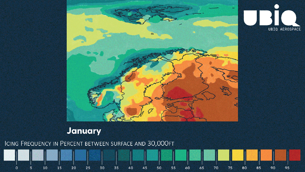 Potential icing condition frequencies over the year – based on a climate analysis spanning data from 2010-2019. Source: UBIQ Aerospace.