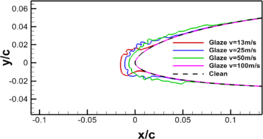 The figure shows how airspeed affects the ice accretion on a glaze airfoil. The faster the aircraft is, the more friction is generates and the more “wet” the ice shapes become.